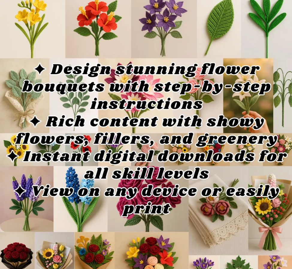 Ready to craft stunning floral arrangements that never wilt? This curated collection of 50+ premium bouquet crochet patterns lets you bring romantic roses, cheerful daisies, elegant tulips, and more to life – perfect for gifts, decor, or your handmade shop!